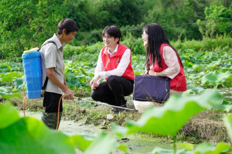 深入贯彻中央八项规定精神学习教育开展以来,江西省抚州市广昌县抓实年轻干部学习教育。2025年5月22日,江西省抚州市广昌县驿前镇年轻干部在贯桥村白莲种植基地走访调研,了解惠农政策落实情况。(赖粤津 人民图片)