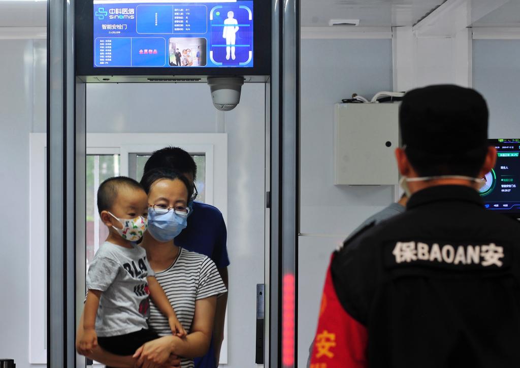 2020年7月12日,人们走过北京儿童医院智能AI安检门。新华社发(牛宏超 摄)