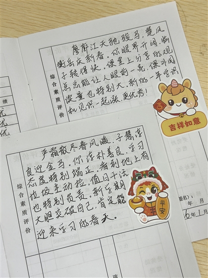 江海区景贤小学的班主任每个学期都会给学生手写期末评语,用亲笔文字传递教育温度。1月30日,景贤小学六(6)班的学生们收到评价手册,纷纷认真品读老师写的期末评语。“廖廓江天驰骏马……”看到老师结合自己名字创作的诗句,廖楚衡眼中闪过惊喜,“能感受到老师很用心,这几句诗我会好好珍藏”。