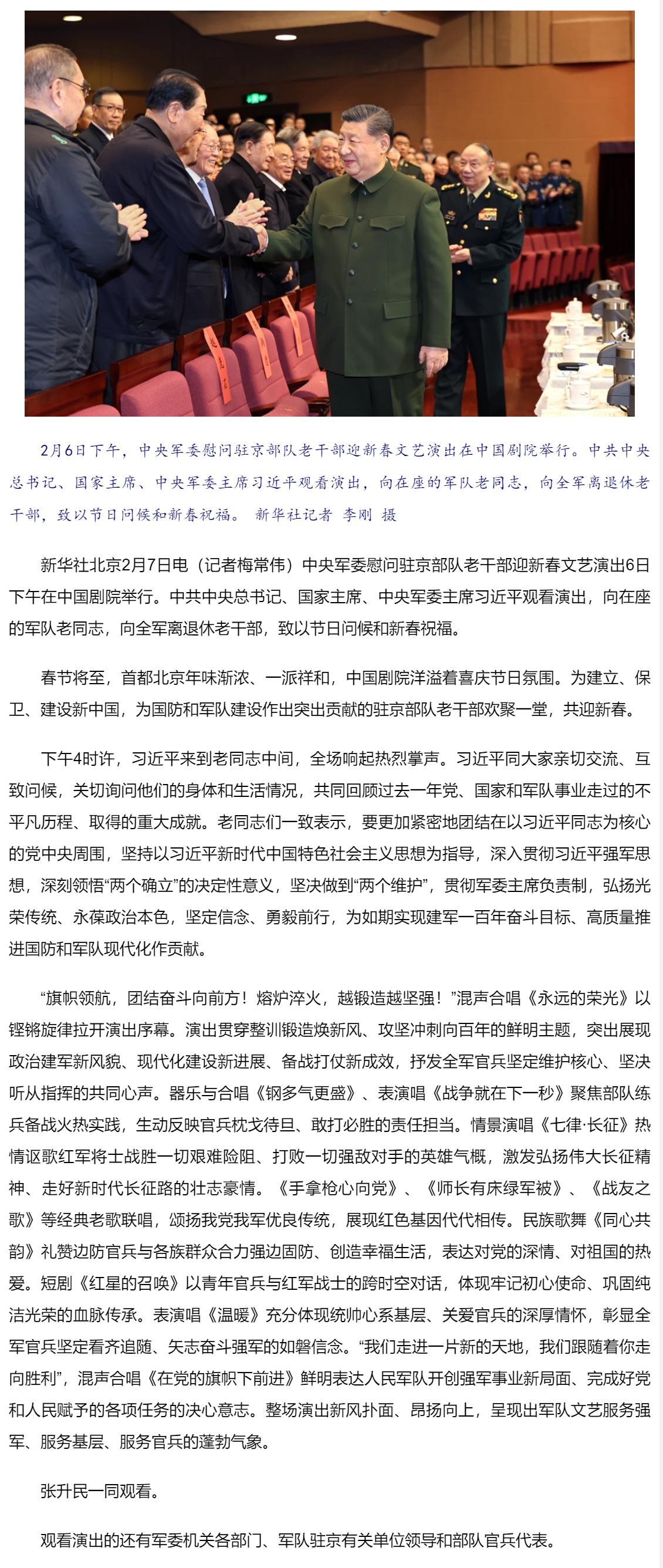 中央军委举行慰问驻京部队老干部迎新春文艺演出 习近平向全军老同志祝贺新春