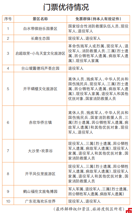 为贯彻落实中央、省、市部署,在全社会营造尊崇军人职业、尊重关爱退役军人的浓厚氛围,市退役军人事务局联合市文化广电旅游体育局,为广大退役军人开展“请到江门过大年”马年新春之约活动,我市部分景区、旅游度假区特别推出拥军优属专属福利。