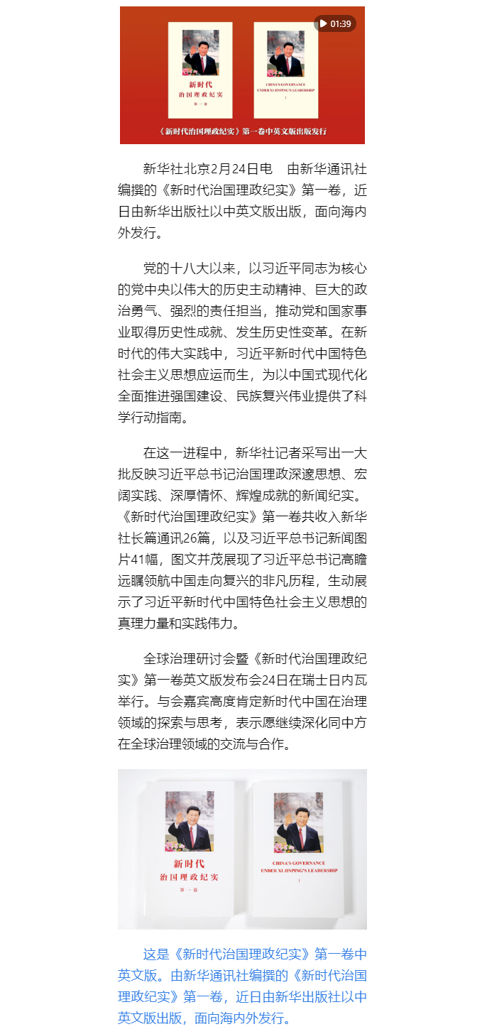 《新时代治国理政纪实》第一卷中英文版出版发行
