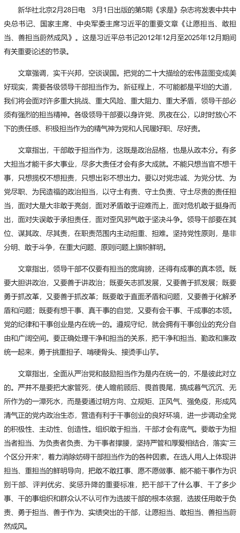 《求是》杂志发表习近平总书记重要文章《让愿担当、敢担当、善担当蔚然成风》
