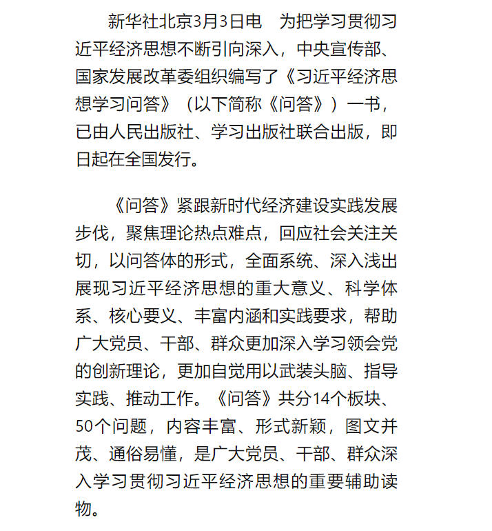 《习近平经济思想学习问答》出版发行