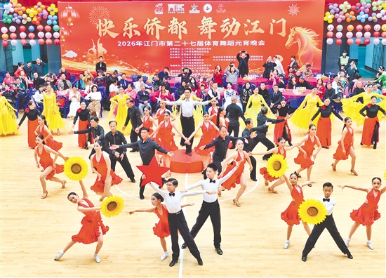 江门日报讯 (记者/郭永乐) 3月3日晚,随着温暖喜庆的开场舞《幸福中国一起走》,“快乐侨都舞动江门”2026年江门市第二十七届体育舞蹈元宵晚会在江门体育馆举办,来自全市的体育舞蹈爱好者们共聚一堂,以共舞欢庆元宵佳节。