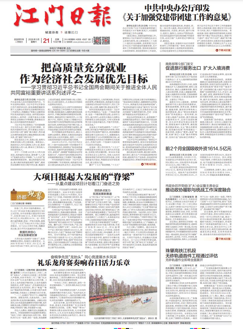 - ② 本网未注明"稿件来源:江门日报"的文/图等稿件均为转载稿,如其他媒体、网站或个人从本网下载使用,必须保留本网注明的"稿件来源",并自负版权等法律责任。