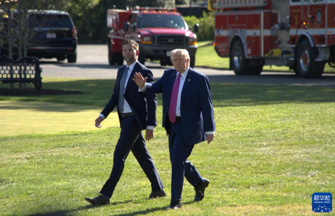 4月10日,美国总统特朗普(右)准备乘直升机离开华盛顿白宫。新华社发(李源清摄)