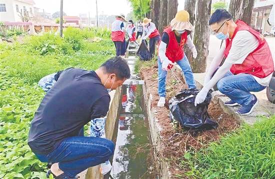 在沙塘镇,志愿者在清理道路沿线、河道、房前屋后垃圾杂草的同时,对沟渠边缘等蚊虫孳生地进行集中消杀,将环境整治与卫生防疫相结合,体现系统治理的思维。