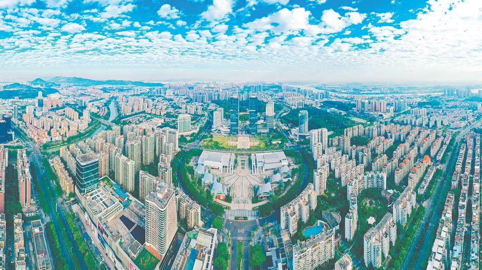 2025年,全市空气质量优良天数比率(AQI达标率)达92.3%,创近十三年来最好水平。图为蓝天白云下的江门城区。郭永乐 摄