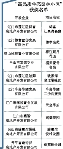 总的来说,在本次评选中,本地的几个实力房企,如博富控股旗下的博学名苑和福美壹号名苑,海悦集团旗下的天玺华府、海悦尚珩华庭和海悦东晟新苑,锦富汇景湾豪庭,骏景湾集团旗下的骏景湾滨江誉峰园和骏景湾悦峰花园,怡福地产旗下的东华名岸园、星湖壹号院、博荟苑,以及半岛华庭二沙岛豪苑、潮闻东方北苑、翡翠观澜花园等,都名列前茅。另外,外来龙头房企,如保利、碧桂园、粤海在江门的项目也榜上有名。